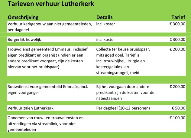 Hieronder vindt u de tarievenlijst voor de Lutherkerk