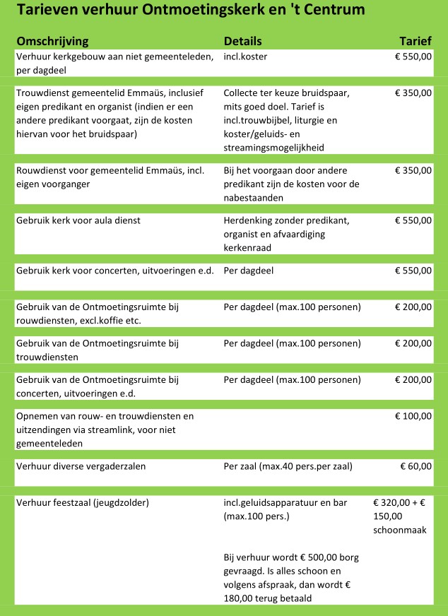 Tarievenlijst Ontmoetingskerk en zalencentrum 't Centrum